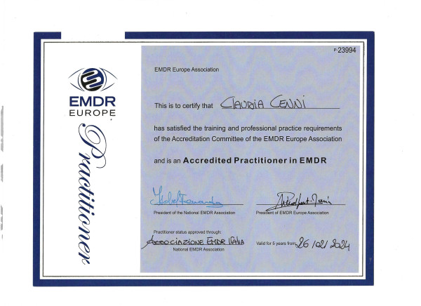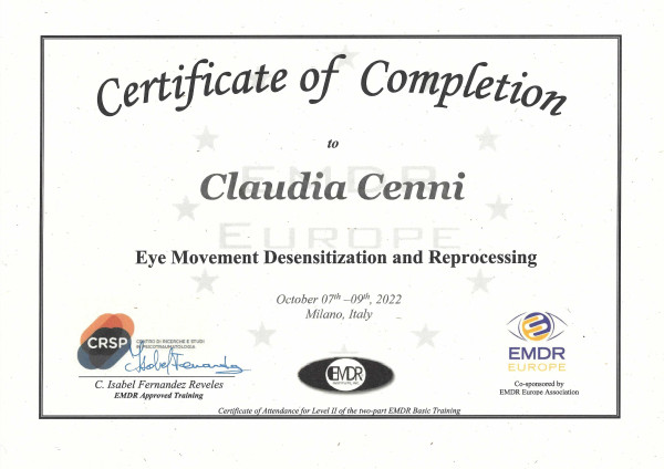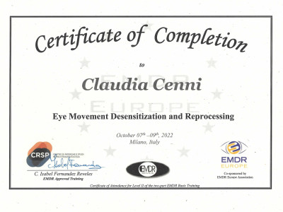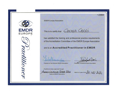 Ho completato la formazione E.M.D.R. all'Istituto di formazione Centro di Ricerche e Studi in Psicotraumatologia EMDR EUROPE (Milano) ottenendo, dopo aver completato i corsi di I e II livello, la successiva qualifica di Esperta "EMDR PRACTITIONER". In seguito ho approfondito l'utilizzo di questo strumento attraverso corsi di specializzazione in diversi ambiti fra cui la Psicologia dell'Emergenza, il trattamento dei Traumi Complessi, dei Disturbi Dissociativi, di Personalità e delle Dipendenze Relazionali.