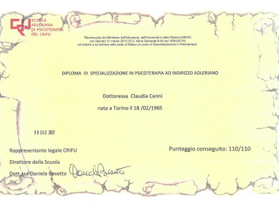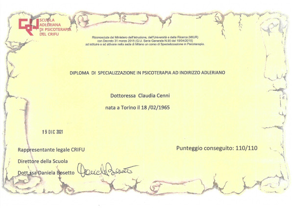 Mi sono laureata in Psicologia Clinica presso l'Università di Pavia e ho conseguito la specializzazione in Psicoterapia Psicodinamica Adleriana a Milano, presso il Centro di Ricerca e Formazione CRIFU.
