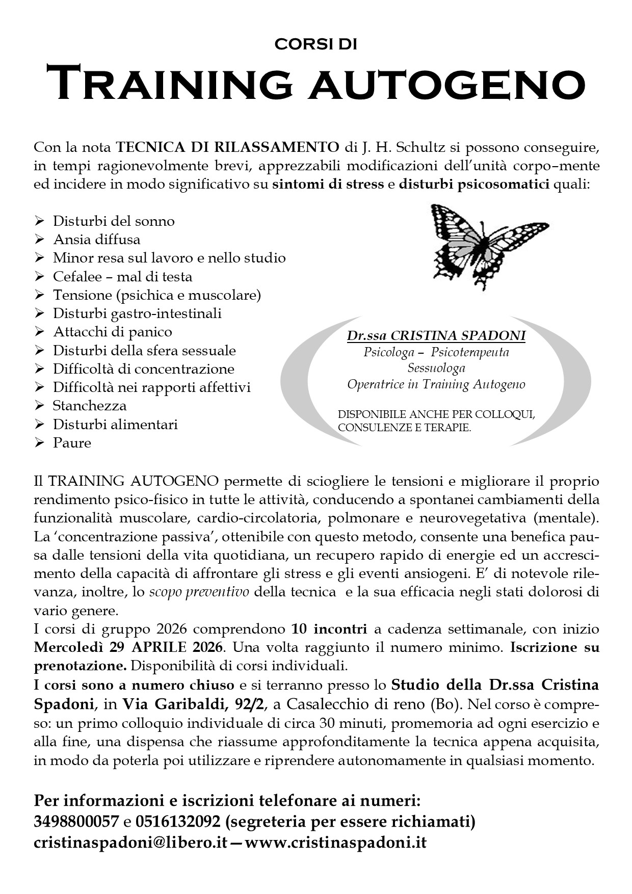 I corsi sono a numero chiuso e si terranno presso lo Studio della Dr.ssa Cristina Spadoni, in Via Garibaldi, 92/2, a Casalecchio di reno (Bo). Nel corso è compreso: un primo colloquio individuale di circa 30 minuti, promemoria ad ogni esercizio e alla fine, una dispensa che riassume approfonditamente la tecnica appena acquisita, in modo da poterla poi utilizzare e riprendere autonomamente in qualsiasi momento.