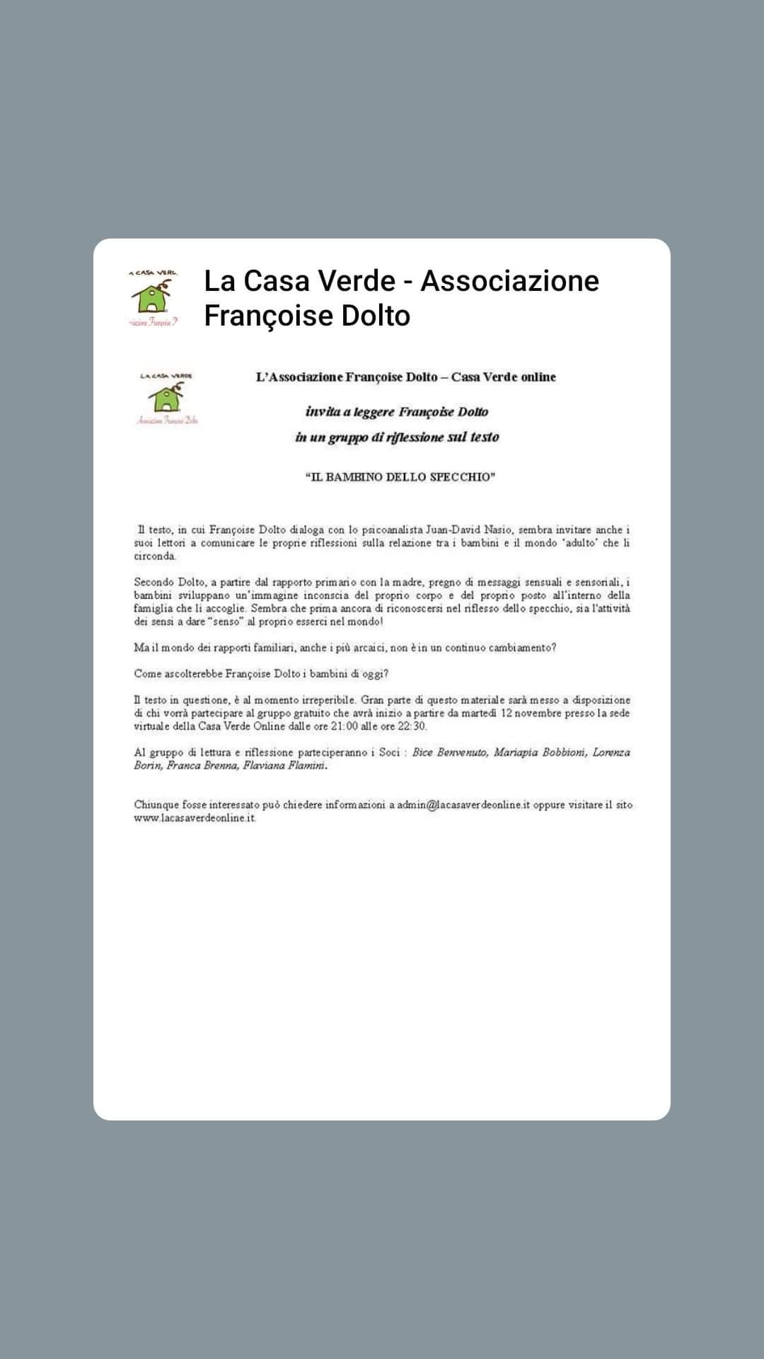 Lettura/discussione testo in cui Dolto dialoga con J-David Nasio. Secondo Dolto a partire dal rapporto primario con la madre i bambini sviluppano un'immagine inconscia del proprio corpo e del proprio posto all'interno della famiglia che li accoglie. Ma il mondo dei rapporti famigliari, anche i più arcaici, non è in continuo cambiamento? Come ascolterebbe Françoise Dolto i bambini di oggi?