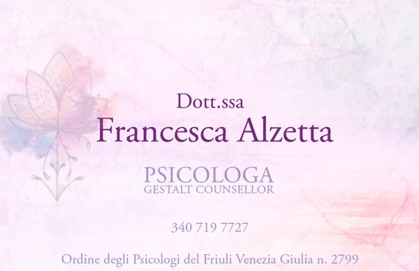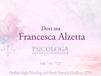 Sono la Dott.ssa Francesca Alzetta e da anni mi dedico con passione e professionalità alla relazione d’aiuto. Mi occupo di sostegno e consulenza psicologica per adolescenti, giovani adulti, adulti e terza età, in uno spazio sicuro e senza giudizio.