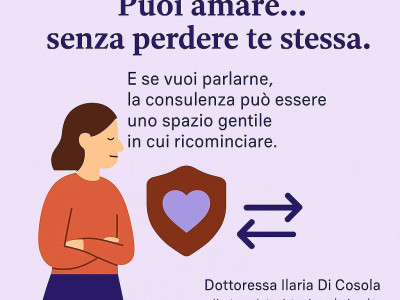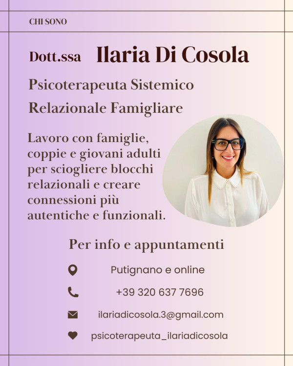 Sono la Dottoressa Ilaria Di Cosola, psicologa clinica e psicoterapeuta ad orientamento sistemico-relazionale-familiare. Sono iscritta all’Ordine degli Psicologi della Regione Puglia ( Sez. A n. 6736).