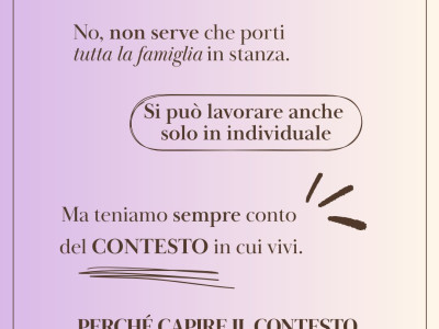 La famiglia e la rete di relazioni sociali che viviamo fuori da essa, giocano in questo approccio, un ruolo fondamentale poiché ci portano inevitabilmente a vivere in maniera più o meno "problematica". Risalire ai vari tipi di famiglie di origine, a quanto un individuo è riuscito a differenziarsi o meno in essa, al raporto con il sottosistema dei fratelli e sorelle, ai miti familiari, al particolare momento o fase di vita che la persona sta vivendo, sono solo alcuni dei temi più importanti che affronto con i miei pazienti.