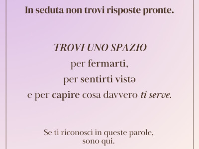 Con un ascolto empatico e privo di giudizi, aiuto i miei pazienti a conoscersi meglio e avere una maggiore consapevolezza delle proprie paure, dei propri limiti, dei propri bisogni inconsci che gli impediscono di vivere a pieno la propria vita e di essere felice. La sofferenza può essere un'opportunità, il punto di partenza per provare a cambiare il proprio "copione"relazionale e, dunque, i pensieri, le emozioni e le dinamiche che impediscono alla persona di "fiorire". In terapia, con amore proviamo ad accoglierli e a trasformarli per creare un autentico cambiamento e una crescita nel modo di vivere e affrontare gli eventi della vita.