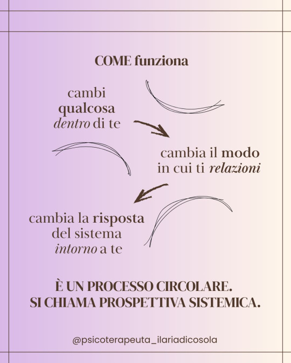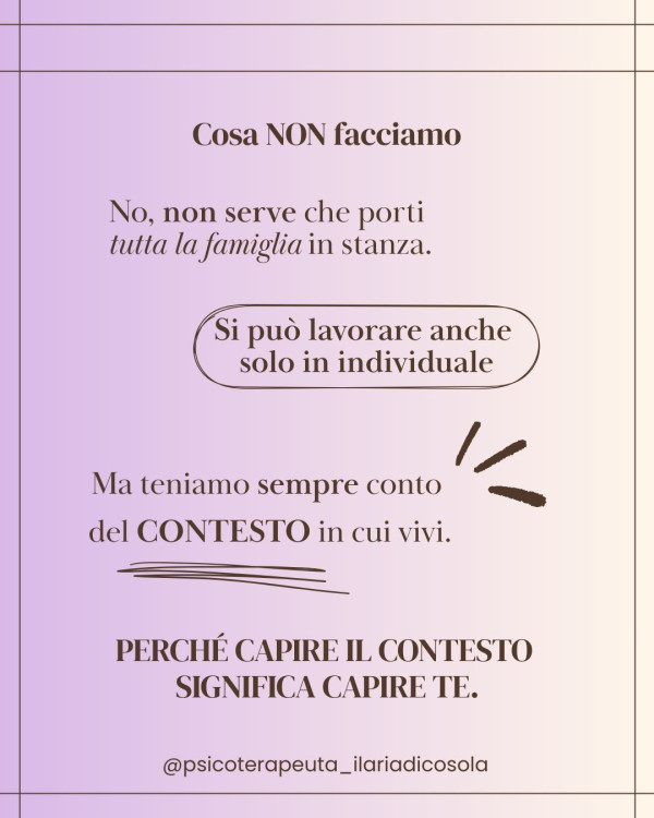 ll mio approccio è di tipo sistemico-relazionale-familiare. Tale modello di riferimento attribuisce un particolare valore al contesto sociale in cui ogni individuo è inserito, ponendo attenzione alla relazione tra l'individuo e la sua famiglia, e alla relazione tra l'individuo e gli altri contesti sociali a cui appartiene (scuola, lavoro, ecc.).