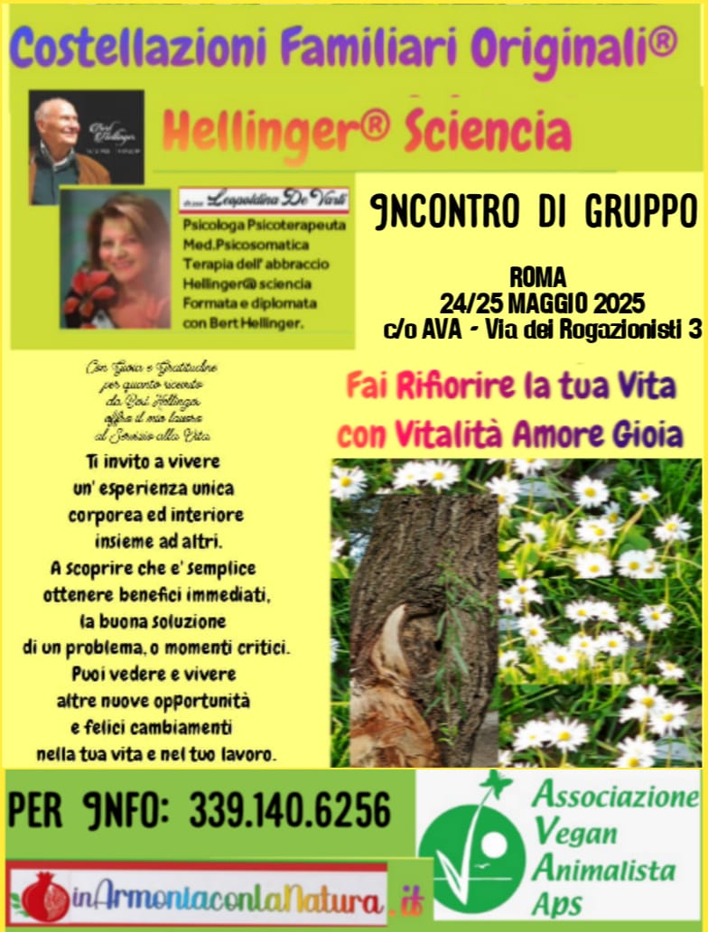 É un' incontro di gruppo in cui puoi vivere un'esperienza diretta e unica con le Costellazioni familiari di Bert Hellinger. Puoi vedere come agiscono per la risoluzione dei problemi nelle relazioni di vita e di lavoro, nel risanamento delle ferite più profonde, nello sciogliere nodi e blocchi, nell' affrontare malattie e momenti difficili. Il modo in cui si svolge l' esperienza è semplice, attraverso l'uso del linguaggio del corpo che manifesta nei movimenti corporei il vissuto delle proprie esperienze di relazione, in coppia, in famiglia, nella vita sociale e lavorativa. Ognuno può chiedere di vedere come risolvere la questione che gli sta a cuore. Attraverso il corpo ci colleghiamo alla dimensione più elevata dell' Anima, che apre un campo nuovo di possibilità. Mentre il movimento interiore dell' Anima ci aiuta a superare ostacoli, ci porta alla buona soluzione, a ritrovare equilibrio e pace, al tempo stesso, ci conduce verso nuove e più grandi opportunità di realizzazione: più amore, più relazioni, più salute, più prosperità, più lavoro, più qualità di vita, più felicità. I benefici sono immediati e si vivono nel qui ed ora dell' incontro. I cambiamenti nella vita e nel lavoro si manifestano positivamente, concretamente e rapidamente. Questo è possibile grazie alle importanti scoperte di Bert Hellinger. In quanto sua allieva diretta trasmetto con gioia e gratitudine nel mio Servizio alla Vita.