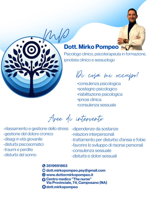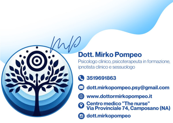 Sono uno Psicologo Clinico Dinamico e Psicoterapeuta i.f. laureato presso l'Università degli Studi della Campania "Luigi Vanvitelli". Sono specializzato in Ipnosi Clinica ad orientamento Ericksoniano presso la S.I.I.P.E. di Roma. In aggiunta, sono Consulente Sessuale specializzato presso l'Istituto di Sessuologia Clinica di Roma, e fornisco supporto e consulenza per promuovere il benessere sessuale e relazionale. Inoltre, offro sostegno psicologico a bambini e adolescenti con disturbi dello spettro autistico presso il Polo socio-sanitario assistenziale "A.I.A.S. sez. Nola". Svolgo attività clinica presso il centro medico "The Nurse" di Camposano, dove ho l'opportunità di lavorare con diverse tipologie di pazienti, contribuendo al loro benessere mentale e alla loro crescita personale.
